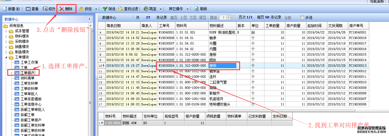 此时,点击“取消工单”按钮,仍然无法取消工单,因为工单的物料项已经排产。要取消工单,先得删除工单排产。